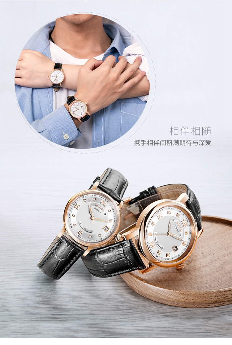 這對夫婦的手表由棕色牛皮表帶,制成,其光滑的表殼由奢華的玫瑰金電鍍制成。既能輕松帶出男性特有的從容氣質,又能彰顯其獨特的個性。女人的小箱子完美貼合手腕,運動時擔心一直抖或者碰到其他地方。讓你隨時隨地享受手腕上的肉感。