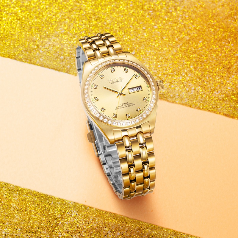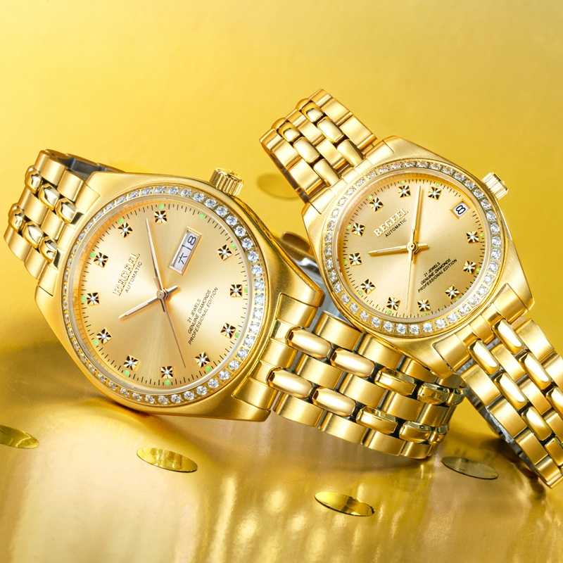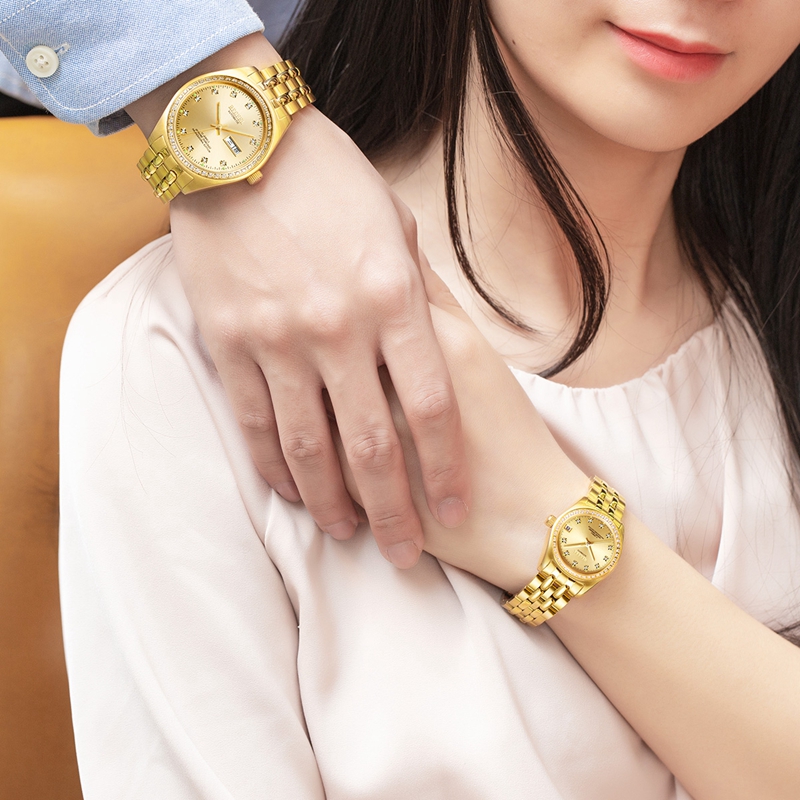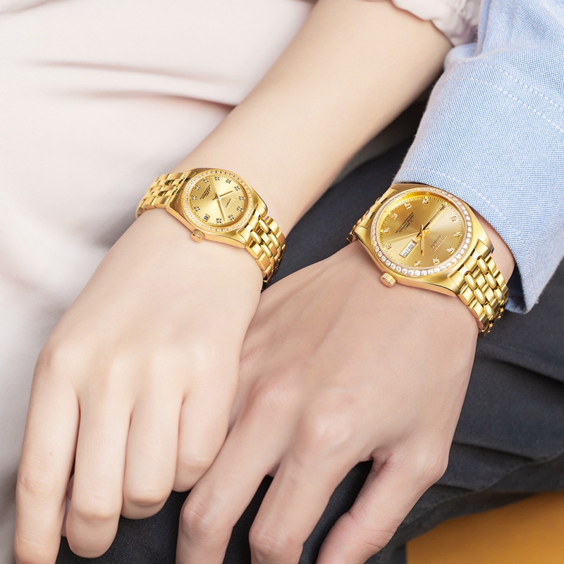 表殼:316L精鋼+電鍍真金,男款鑲嵌46顆水晶鉆,女款鑲嵌40顆水晶鉆