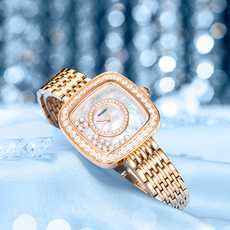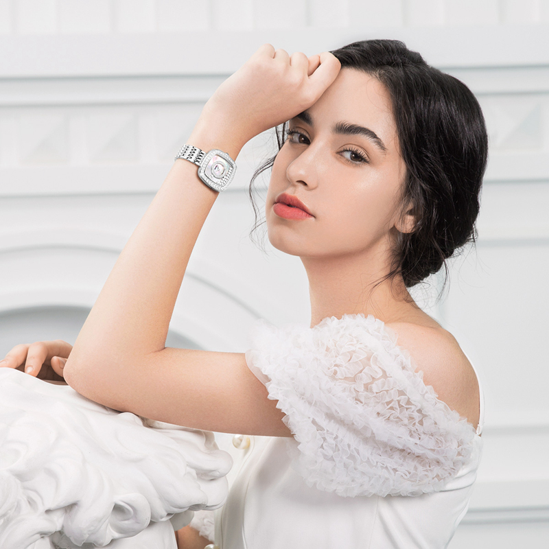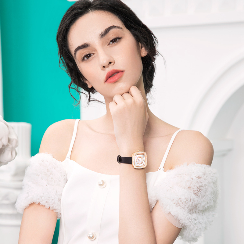 以自然界的雪花元素為設計靈感,采用新穎別致的枕形表殼設計,腕表運用了珍珠母貝和水鉆鑲嵌工藝,閃閃發光的水鉆在表盤上,圍繞小表盤自由地流動,輕盈靈動,仿佛雪花在表盤之上起舞,動感十足,表盤上營造出冰雪紛落的浪漫景致。玫瑰金光澤與璀璨水鉆交相輝映,精湛工藝賦予腕表非凡魅力。