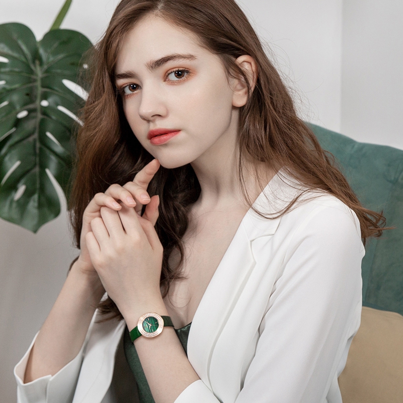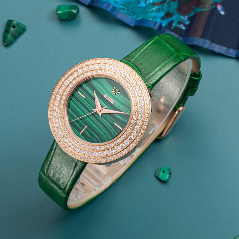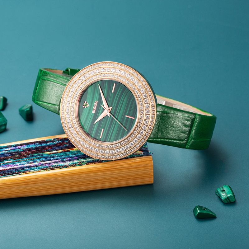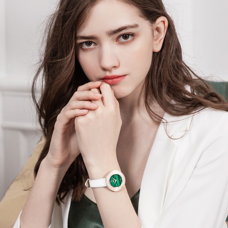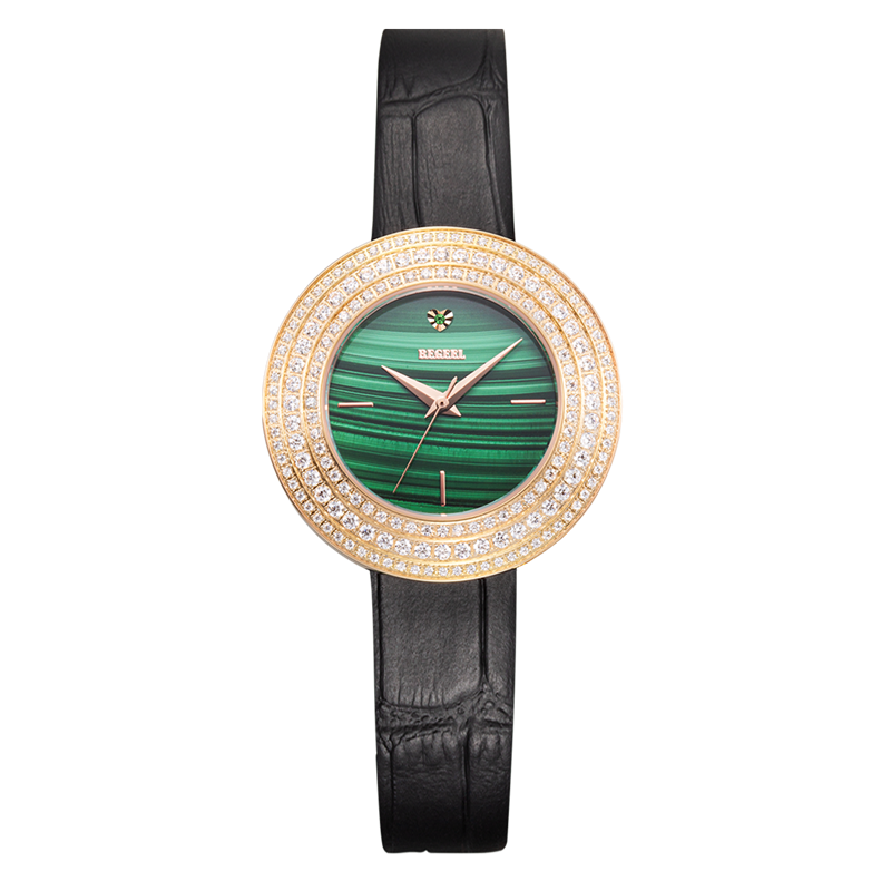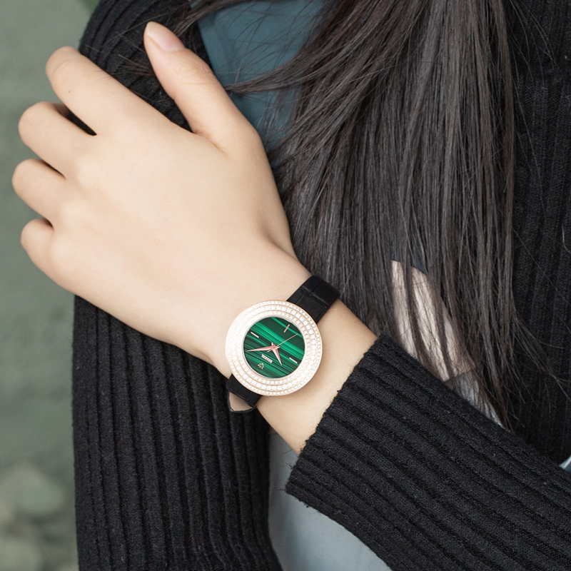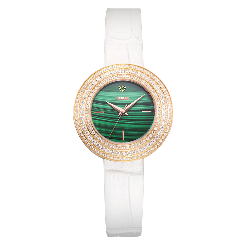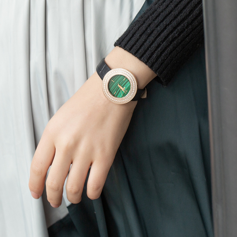 融合了風(fēng)格纖巧、精美、浮華的洛可可藝術(shù)風(fēng)格以及圓舞曲的概念創(chuàng)作,打造出做工精致、充滿(mǎn)詩(shī)意的腕表精品。精致溫潤(rùn)的玫瑰金表圈鑲飾三層水晶鉆圈,孔雀石紋理表盤(pán)設(shè)計(jì),飾以沙弗萊石襯托優(yōu)雅氣質(zhì);經(jīng)典玫瑰金太子妃指針,干凈利落,與原型表盤(pán)剛?cè)嵯酀?jì);搭配繽紛表帶,隨心替換,百搭時(shí)尚。