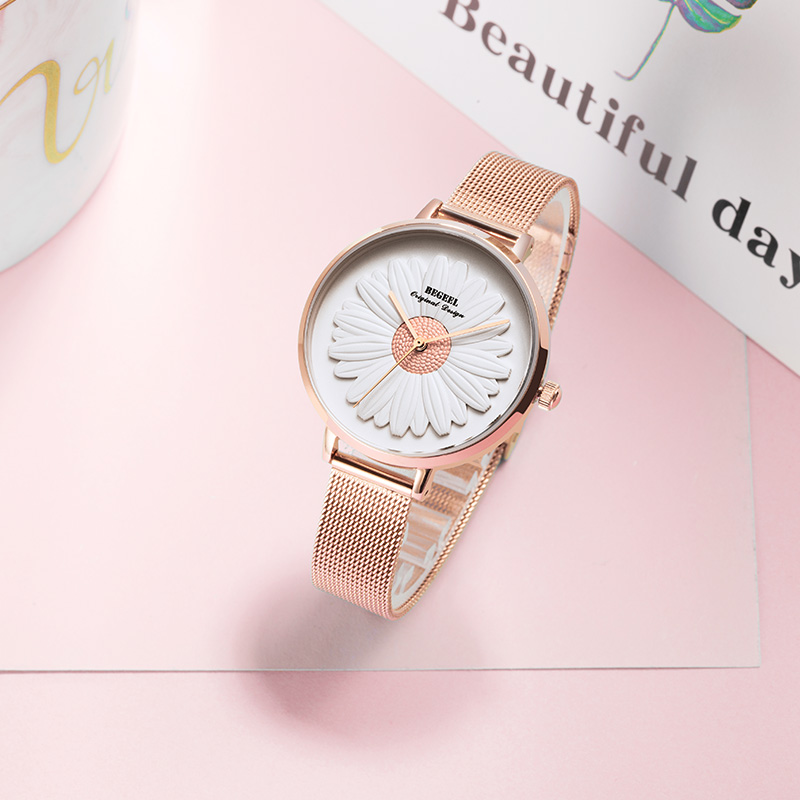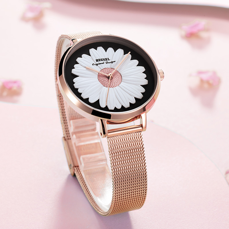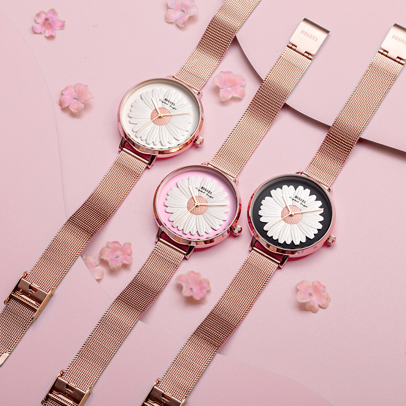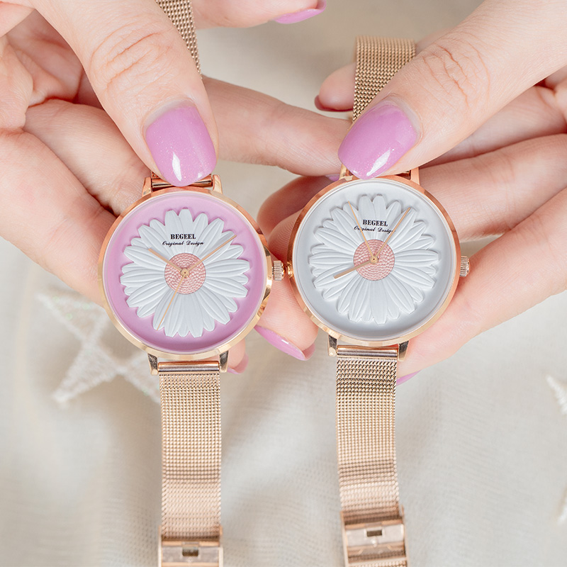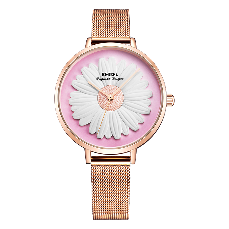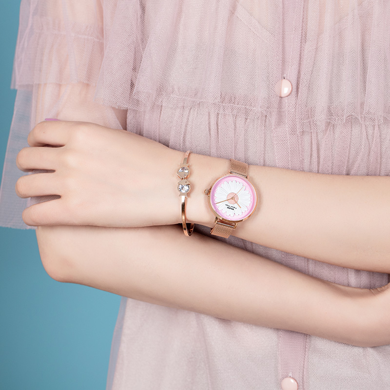 以大自然元素,設(shè)計(jì)出妙趣橫生的清新少女風(fēng)腕表。白色的雛菊花瓣微微含露,立體而有質(zhì)感,像少女的悸動(dòng)含羞。清新浪漫雛菊立體表盤,素顏的配色的3D花朵宛如腕上花園,多一分俏皮。妙趣橫生的自然之美,讓人一見鐘情。淡雅的顏色和留白、粉色、黑色設(shè)計(jì),展現(xiàn)出了田園風(fēng)和淑女式的優(yōu)雅。