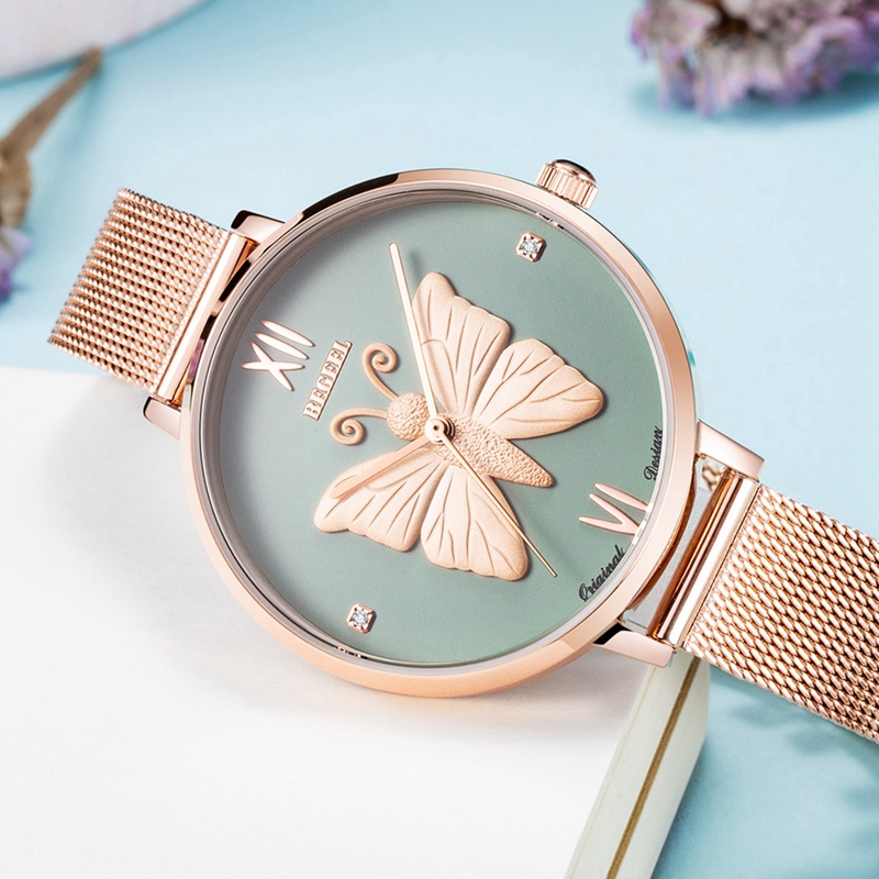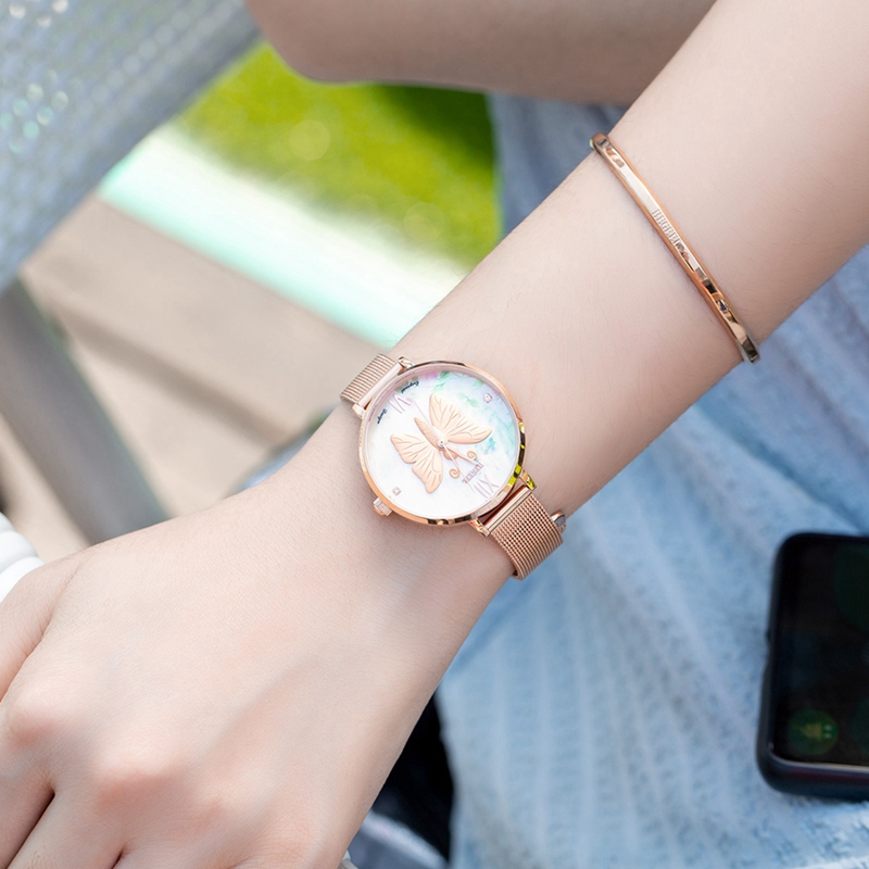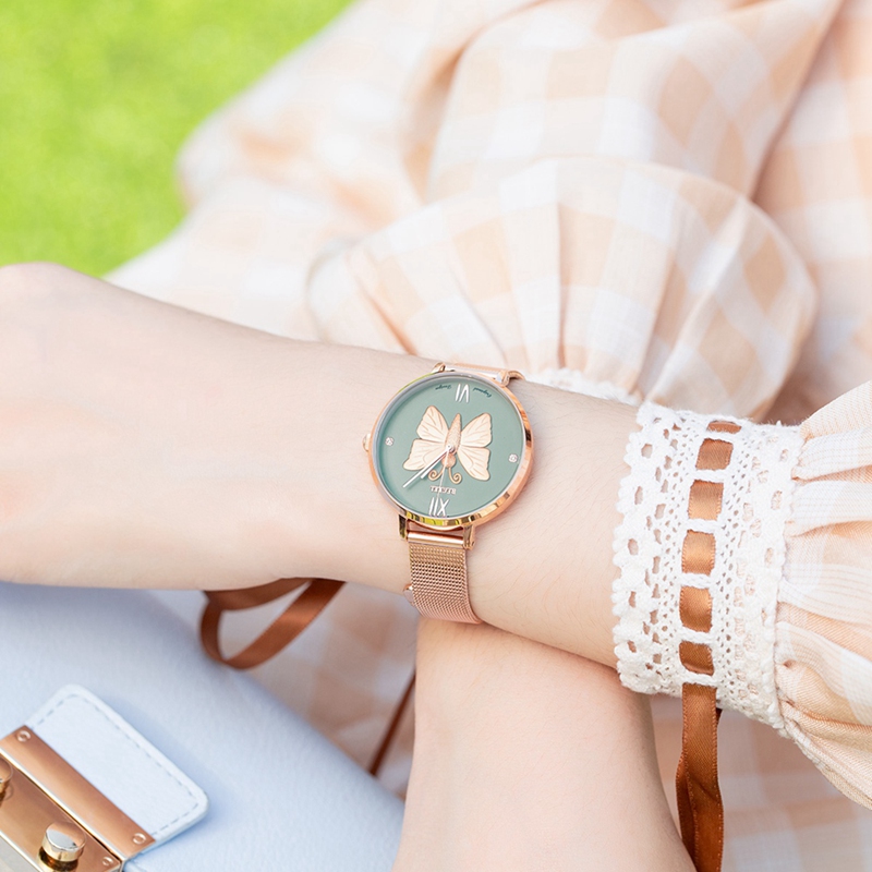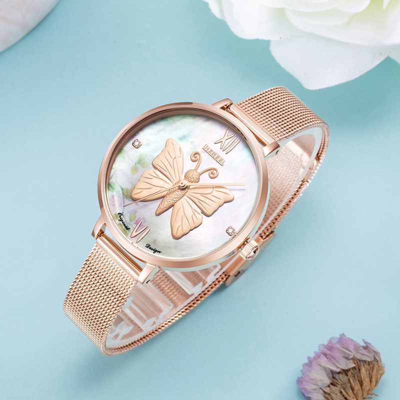 走進(jìn)自然系列表款之一。采用先進(jìn)的3D打印技術(shù),在字面上雕刻出栩栩如生的蝴蝶圖案,釋放自然魅力;貝殼面款彩印花卉背景,營造蝶舞花叢的自然美景,讓佩戴者無論何時,抬手間,腦海里就迎面撲來一股大自然的氣息。