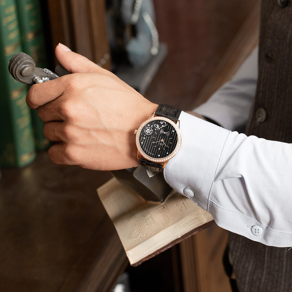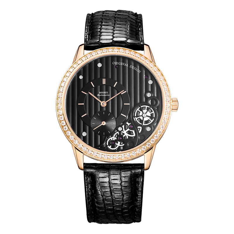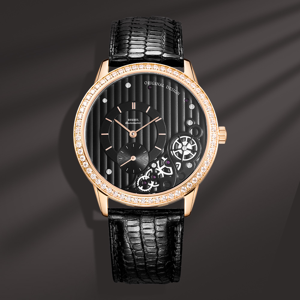 捕捉流變的光與影,黑色圓環(huán)狀表盤,機(jī)芯結(jié)構(gòu)設(shè)計(jì),就像夜幕下的城市光影背后,給人無(wú)限想象,領(lǐng)略不一樣的精彩。腕表摒棄傳統(tǒng)腕表設(shè)計(jì),帶來(lái)更加強(qiáng)烈的視覺(jué)沖擊,表殼的外形線條規(guī)整簡(jiǎn)潔,并鑲飾一圈水鉆點(diǎn)綴,奢華中又透出幾分簡(jiǎn)單率性的現(xiàn)代氣質(zhì),將賓爵機(jī)芯的優(yōu)良品質(zhì)與充滿設(shè)計(jì)感的表盤,能夠看到齒輪、精巧部件的韻律,讓腕表充滿了機(jī)械的魅力。
