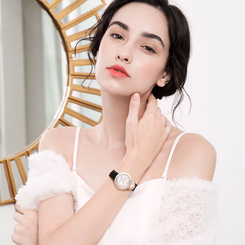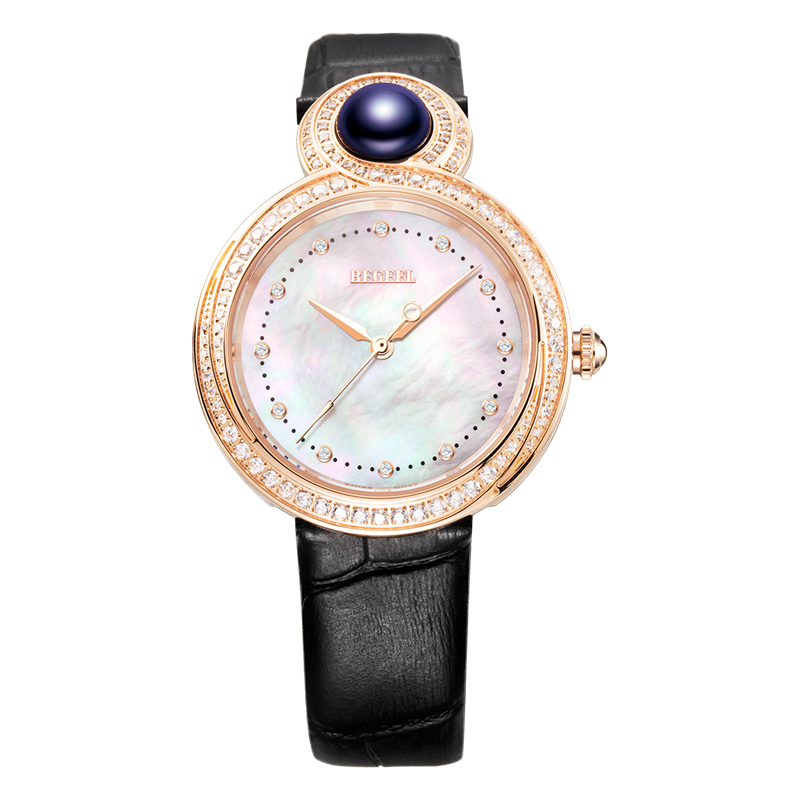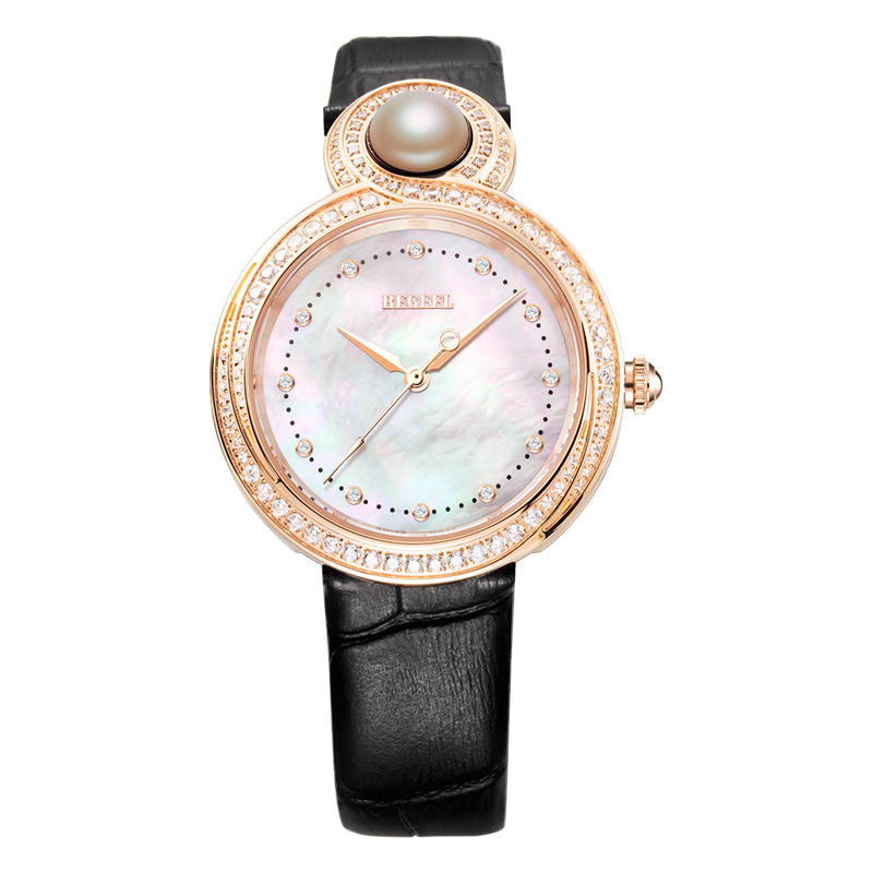 表殼:316L鋼 電鍍玫瑰金, 鑲水鉆共108粒, 12點位鑲珍珠 紫星云/湘妃玉/白晝翠