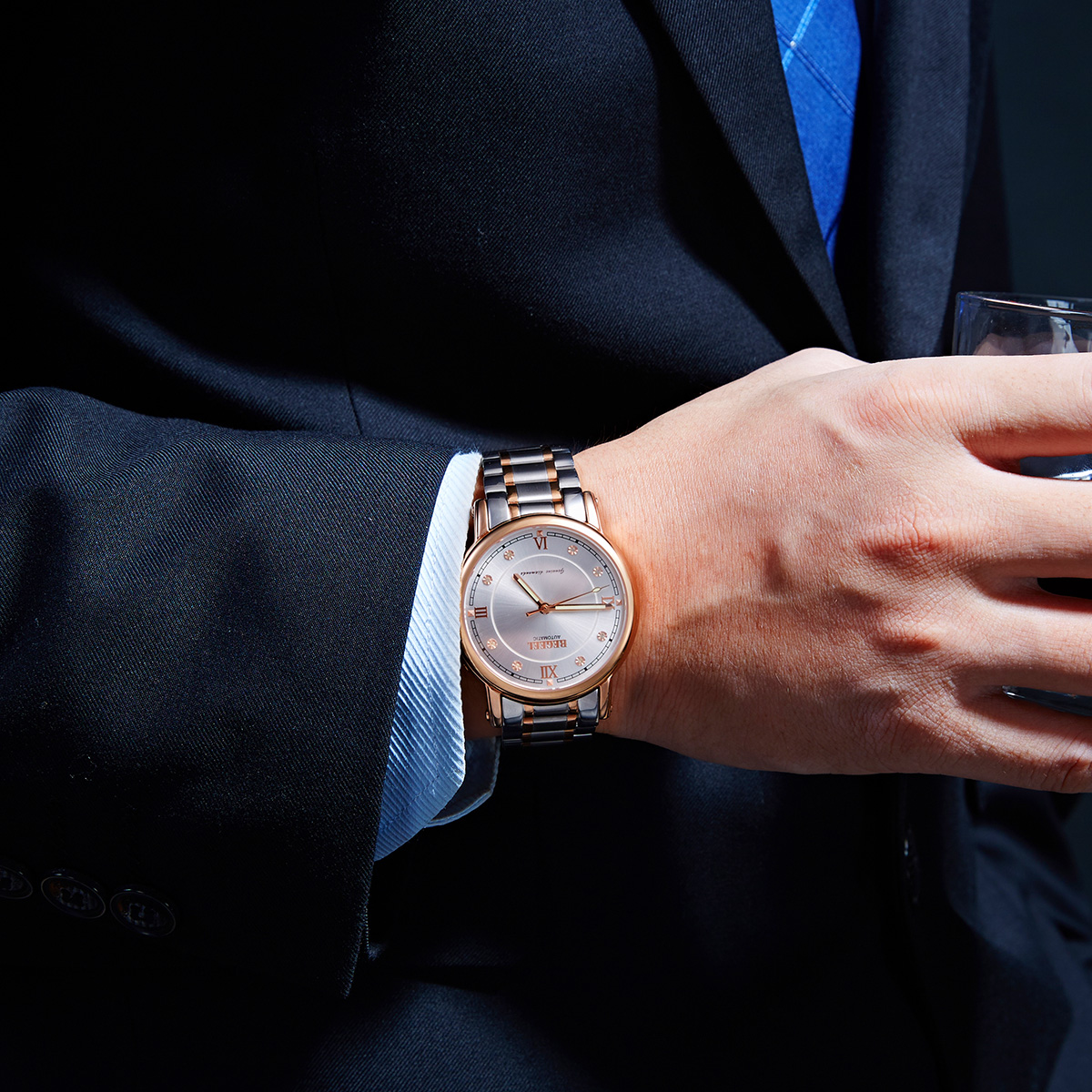 從攝影師的鏡頭中汲取靈感,運用同心圓和軌道紋設計,重現鏡頭下的立體光影變幻。透過藍寶石水晶表鏡,圓形表盤的精致細節盡收眼底,靈感源自單反相機鏡頭的透鏡,光線進入透鏡會在感光元件上匯聚成像,中心銀色拉絲太陽紋小表盤,完美復刻了透鏡下流轉的光影,炫彩奪目。中間刻度圓環設計源自相機鏡頭的前蓋,軌道紋設計源自黑色對焦環,設計師將相機的結構特色和鏡頭下的光影效果融入腕表設計,定格美好時光。