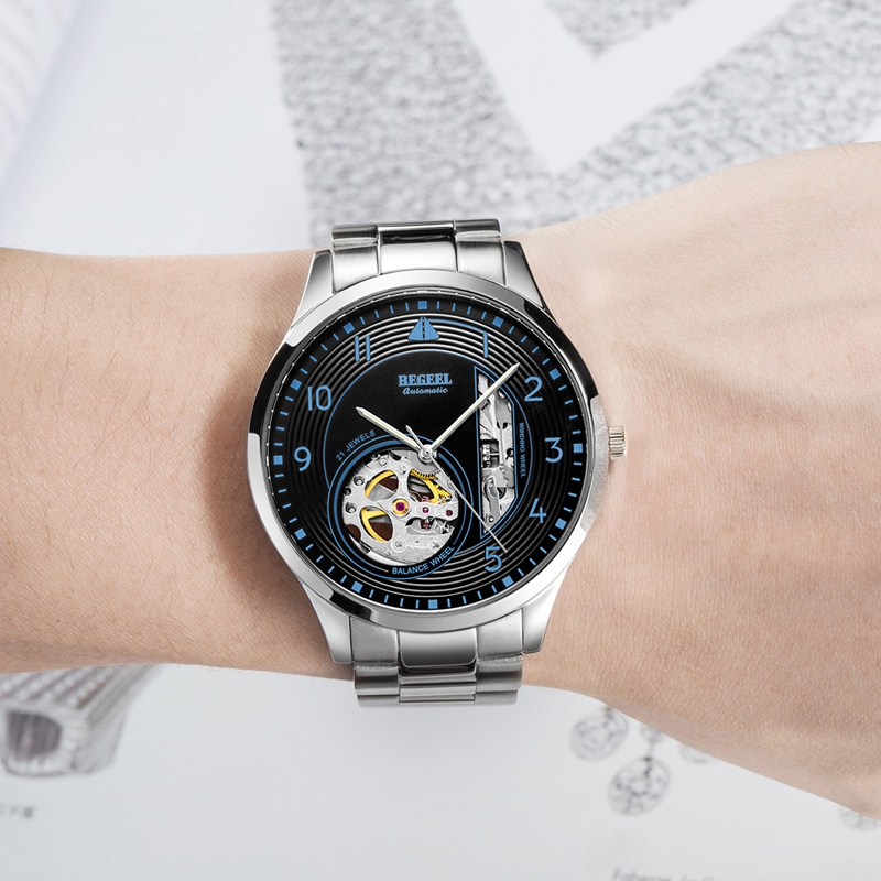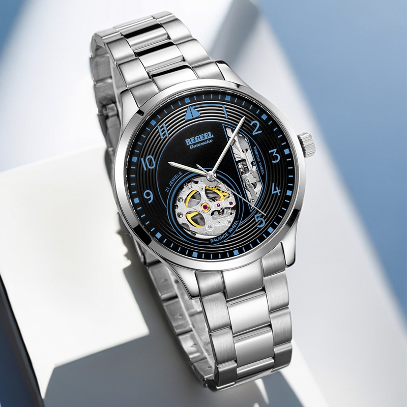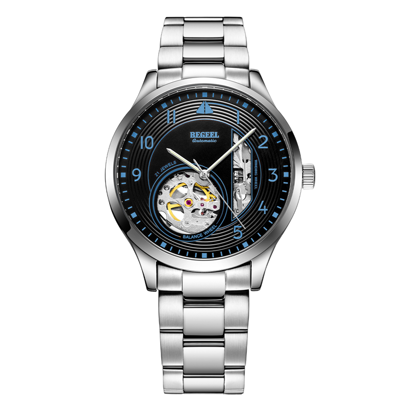 仰望倉穹,北斗七星中格外閃亮的天狼星,銀白純潔之光閃耀天際。設計師以此為靈感利用不規則鏤空設計打造個性盤面,方寸之間盡顯三維立體。夜光刻度圈憑借細膩日內瓦紋從外圈上躍然而起,搭配強夜光指針,令人眼前一亮,為其命名為天狼星,寓意「夢帆啟航,發光發熱」。
