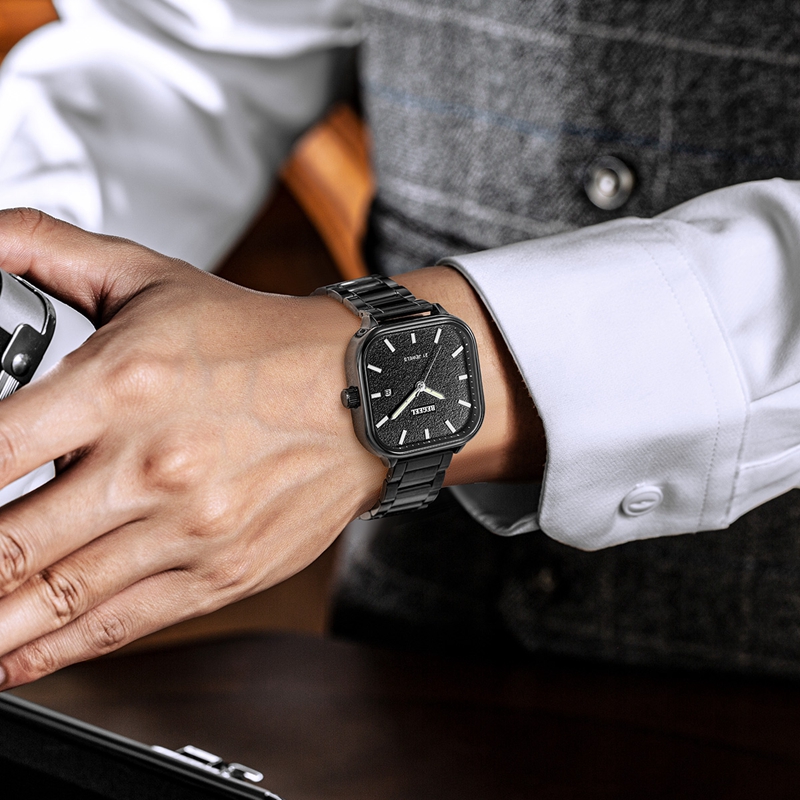 UNIVERSAL·寰宇系列-以茂密的叢林為設(shè)計(jì)靈感,將硬朗的方形表盤設(shè)計(jì)融入時(shí)計(jì)之中,并以暗黑質(zhì)感的磨砂面勾勒出密林的神秘與險(xiǎn)峻,幽暗森林,險(xiǎn)象環(huán)生,可有一群人不畏險(xiǎn)阻,旨在打破未知的迷茫,尋求其背后的真實(shí)。這款暗黑森林腕表也象征著賓爵腕表對(duì)探索者致以的崇高敬意。