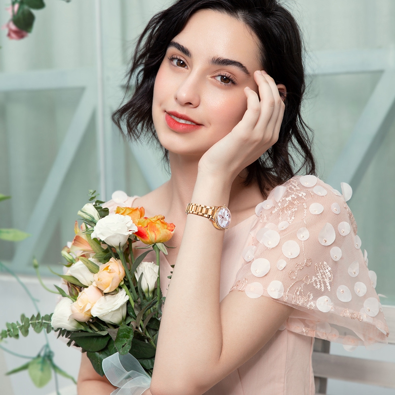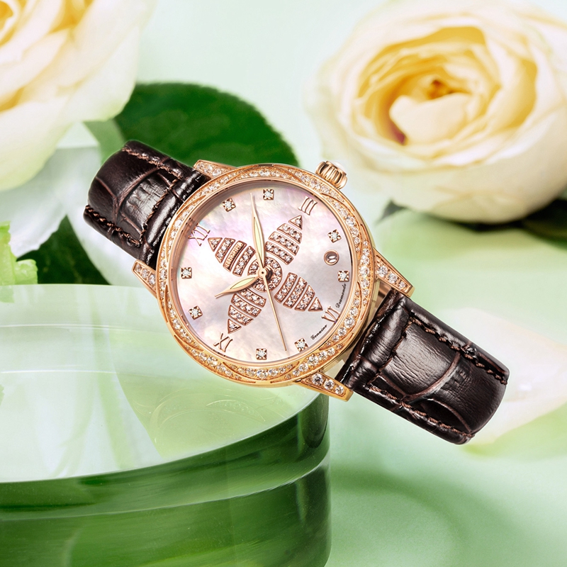 蜜蜂不僅是勤勞的象征,也是早期歐洲名流的幸運家徽,代表家族團結一心和尊貴身份的隱喻,設計師在珍珠母貝盤面上爪鑲工藝將蜜蜂生動勾畫,表殼則以閃耀水晶鉆和電鍍玫瑰金材質打造一朵盛放的花卉,唯美花園場景霎時躍然腕間,寓意時光如蜜,幸運常伴。