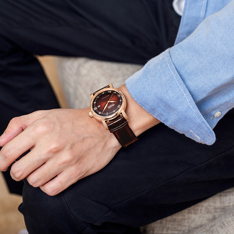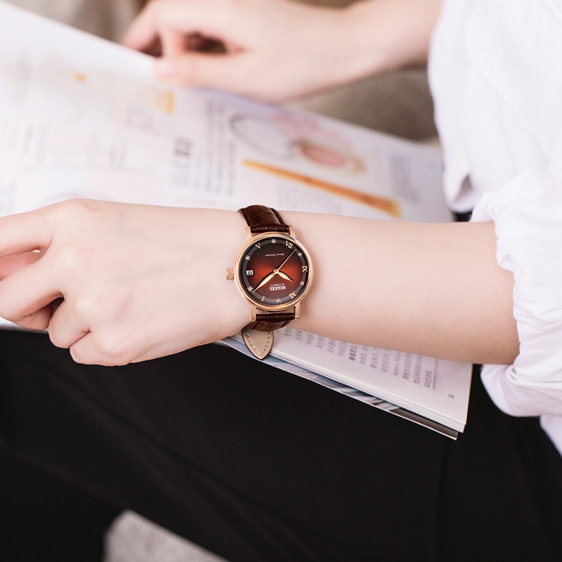 字面:咖色豹眼面,羅馬刻度, 鑲6顆天然真鉆,絲印Logo,強夜光針,單日歷顯示