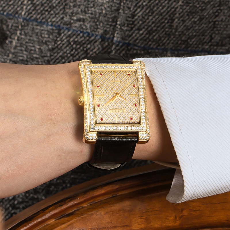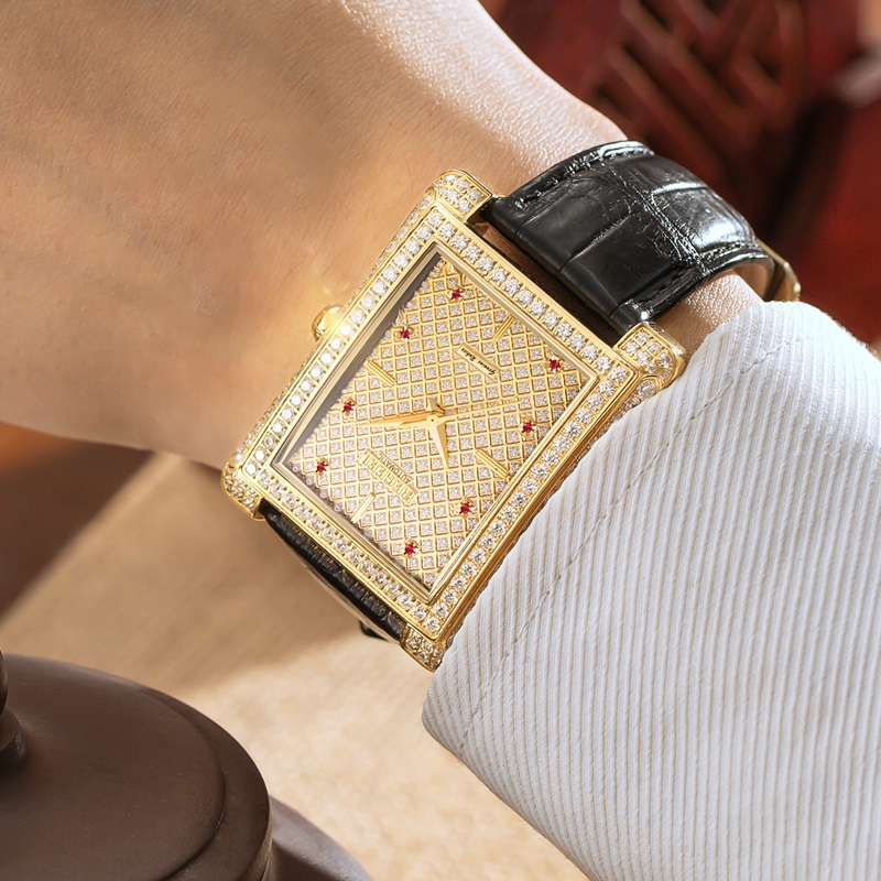 取鑒于盧浮宮入口的玻璃金字塔,為腕表注入渾厚的文化藝術美感。盤面菱形格重復交錯的創(chuàng)新運用,就像夜燈映照出倒影的巴黎盧浮宮,氣勢恢宏;紅寶石與水晶鉆交輝,自帶破勢氣場,邀您一起開啟一場獵金行動。