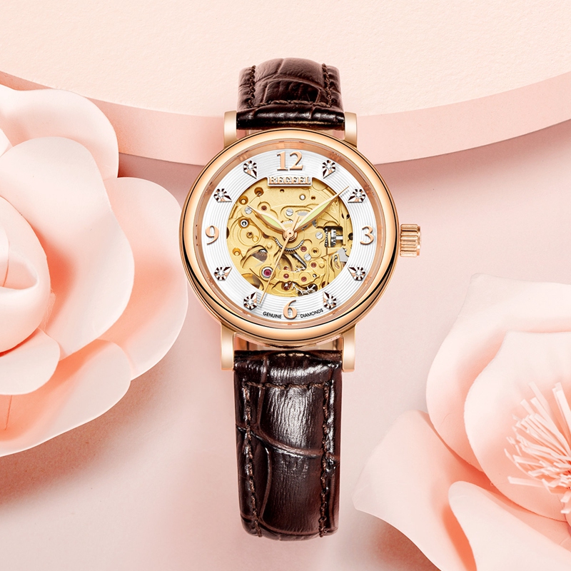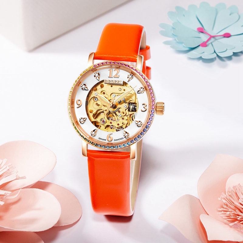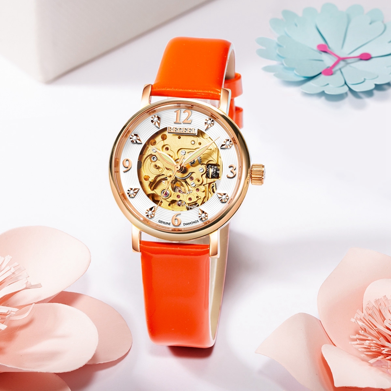 表帶:316L精鋼+電鍍真玫瑰金/電鍍真金,咖色牛皮/光面橙色皮/竹節紋啞光牛皮帶