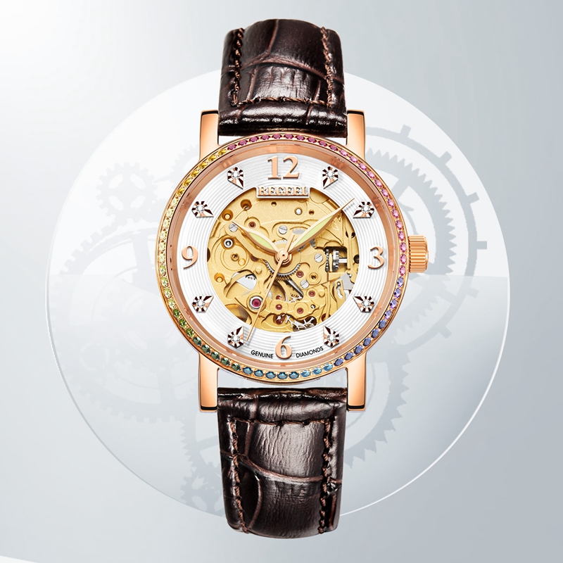 表殼:316L精鋼+電鍍真玫瑰金,圈口:鑲65顆合成彩色鋯石/白色鋯石/光圈/紅圈(52顆晶鉆+4顆方形紅色晶鉆)