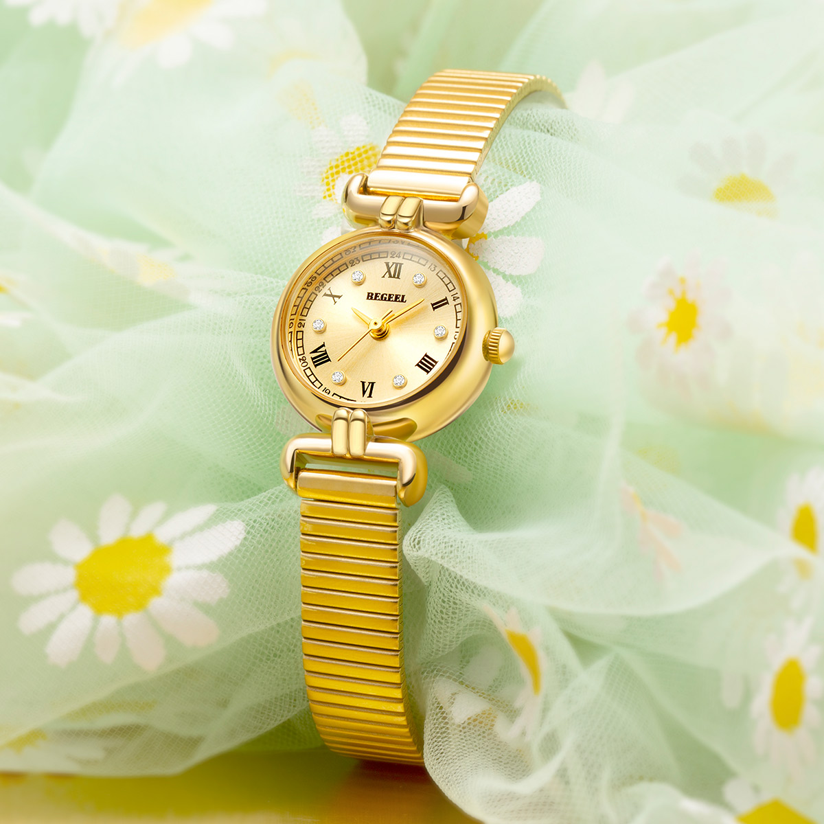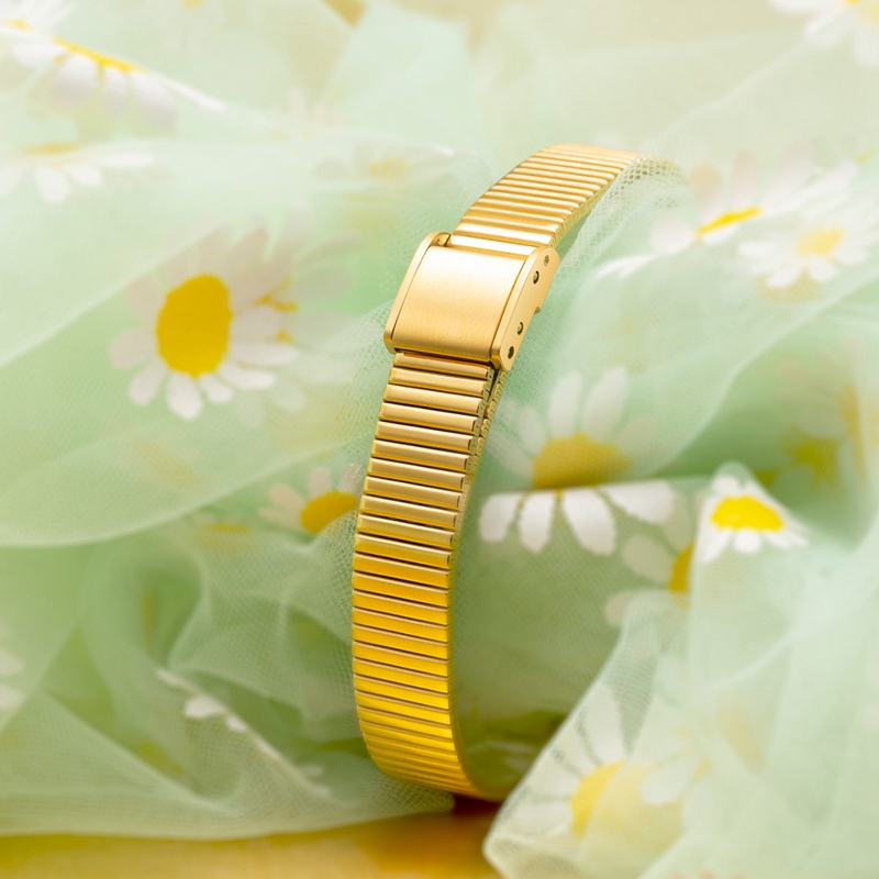 DREAM·夢想系列-小辰光— 腕表采用PVD真空離子鍍金技術,將真金鍍于表體,光澤迷人;盤面細膩太陽紋理如同晨光初現,寧靜而輕盈,帶來無限美好的期待。