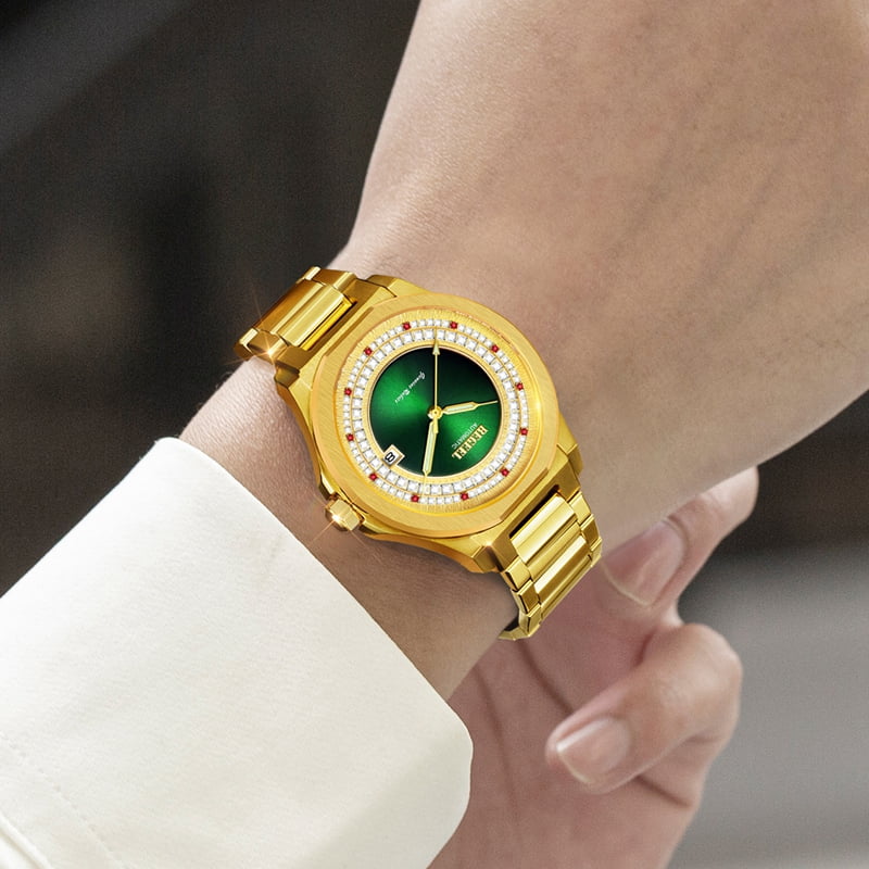 字面:雙紋理,金色流沙紋和綠色太陽紋,鑲約105顆方晶鉆,12顆真紅寶石 約0.012ct, 強夜光針