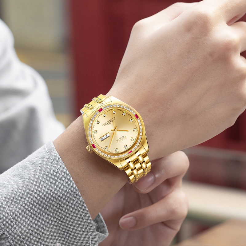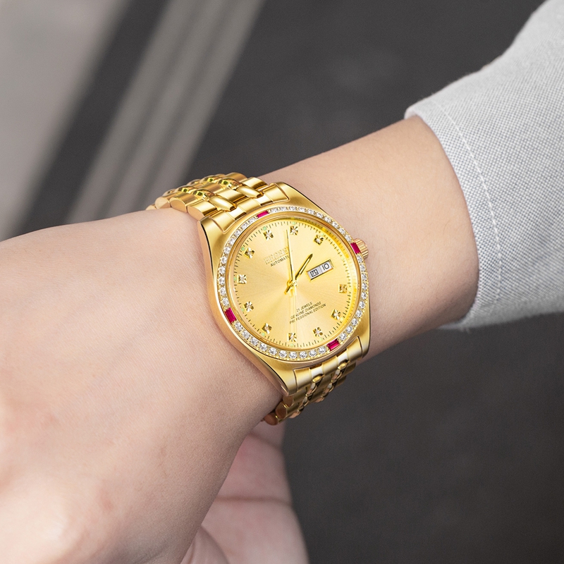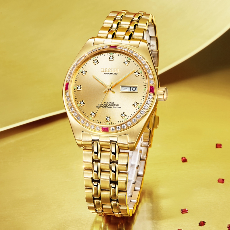 表殼:316L精鋼+電鍍真金,鑲40顆晶鉆, 4顆紅方晶鉆
