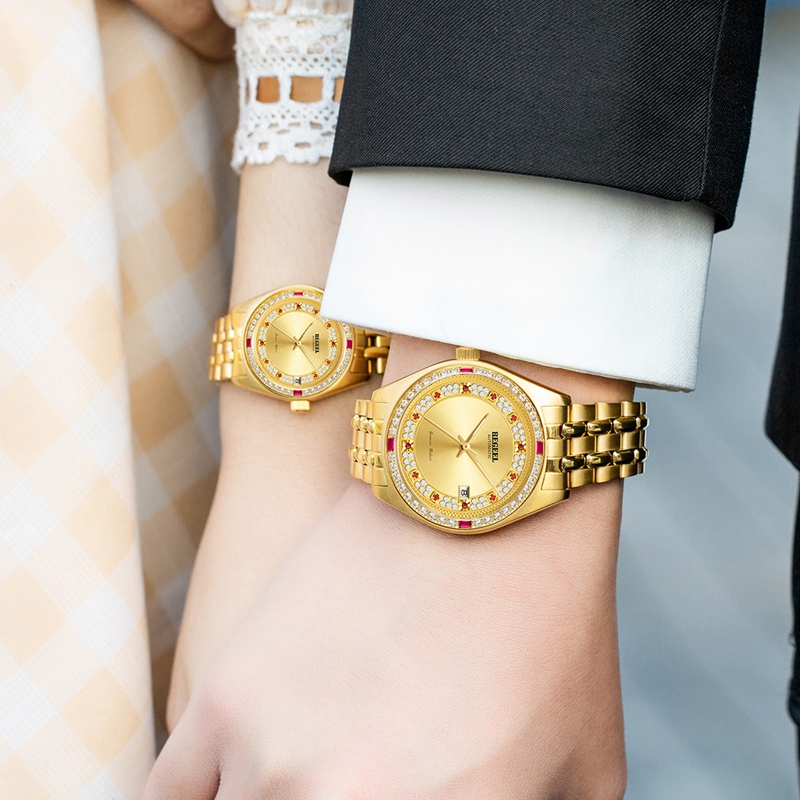 表殼:316L精鋼+電鍍真金,男款鑲44顆晶鉆;女款鑲40顆晶鉆