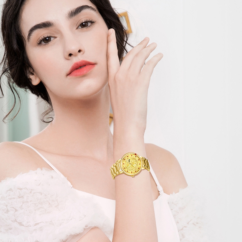 表殼:316L精鋼電鍍金,鑲57顆晶鉆,1顆Big合成紅寶石
