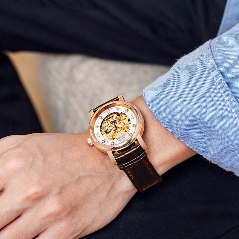 表帶:316L精鋼+電鍍真玫瑰金/電鍍真金,咖色牛皮