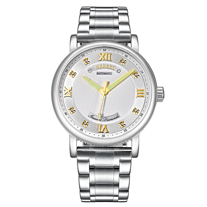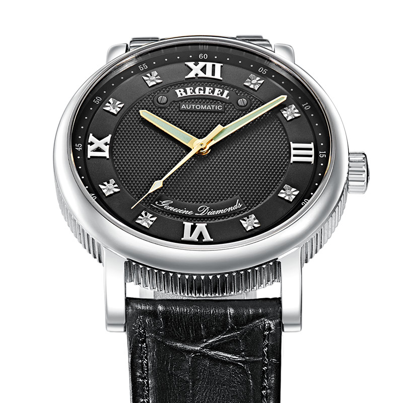 設計靈感源自20世紀30年代的Art-deco裝飾藝術風格,簡潔的幾何構圖與線條設計,將精致典雅與摩登時尚相融合。簡約圓形設計表盤,優美的弧線交織,呈現出平衡和諧的美感。表盤中央大面積的“鉆石尖端”(巴黎釘紋)整齊鋪排的,巴黎釘紋飾是典型的Art-deco裝飾風格的設計語言,古典優雅。