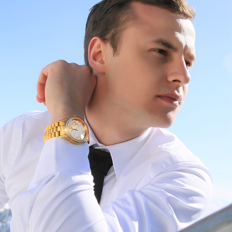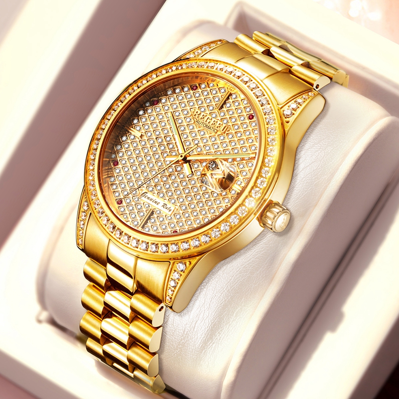 GOLDEN·流金系列-設計靈感源自蘇格蘭歷史文化象征——Argyle(普林格紋),鉆石般的普林格紋在表盤上縱橫交錯,233顆閃亮圓形水晶鉆鑲嵌其中,亮麗奪目,閃耀動人。全金表體給人以溫暖沉靜之感,自帶低調的奢華感。圓潤流暢的滿鑲表殼表盤,8顆紅寶石時標,搭配三珠全金表帶,彰顯英式愜意精致的生活態度。